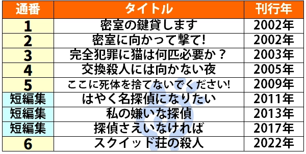 烏賊川市シリーズを読む順番は、密室の鍵貸します→密室に向かって撃て!→完全犯罪に猫は何匹必要か?→交換殺人には向かない夜→ここに死体を捨てないでください!→はやく名探偵になりたい→私の嫌いな探偵→探偵さえいなければ→スクイッド荘の殺人。