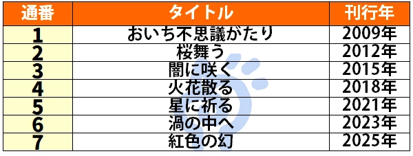 おいち不思議がたりを読む順番は、おいち不思議がたり→桜舞う→闇に咲く→火花散る→星に祈る→渦の中へ→紅色の幻。