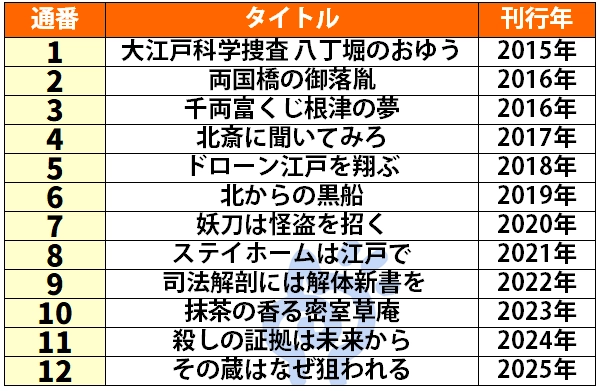 八丁堀のおゆうを読む順番は、無印→両国橋の御落胤→千両富くじ根津の夢→北斎に聞いてみろ→ドローン江戸を翔ぶ→北からの黒船→妖刀は怪盗を招く→ステイホームは江戸で→司法解剖には解体新書を→抹茶の香る密室草庵→殺しの証拠は未来から→その蔵はなぜ狙われる