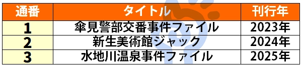 流警シリーズを読む順番は、傘見警部交番事件ファイル→新生美術館ジャック→水地川温泉事件ファイル。